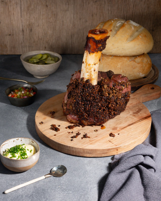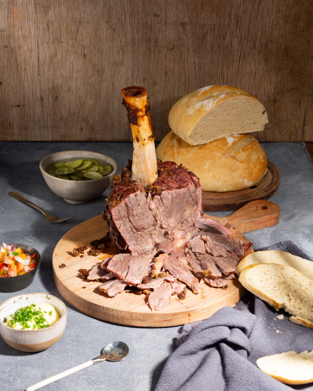 Osobuco del rey marinado en salmuera, condimentado, ahumado y cocido al estilo pastron. Viene acompañado con pletzalej, pickles de pepinos y mayonesa alioli. Dando como resultado de esta combinación un sabor único. Todo 100% casero.
