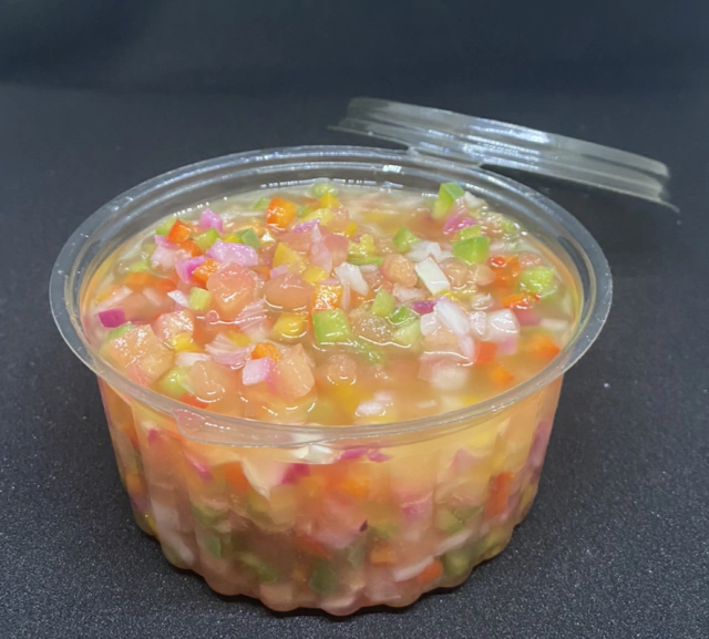 Salsa criolla casera hecha con morron rojo, amarillo, verde; cebolla morada y blanca y tomate sin cascara. Aceite y vinagre.